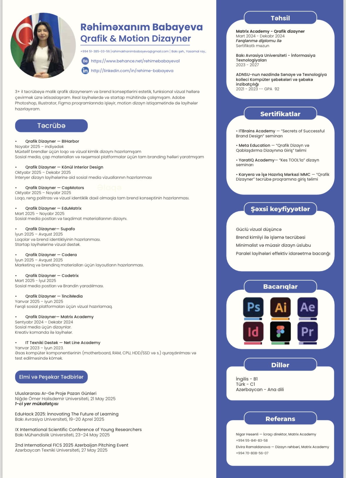 3+ il təcrübəyə malik qrafik dizaynerəm və brend konseptlərini estetik, funksional vizual həllərə çevirmək üzrə ixtisaslaşıram. Real layihələrdə və startap mühitində çalışmışam. Adobe Photoshop, Illustrator, Figma proqramlarında işləyir, motion dizayn istiqamətində də layihələr hazırlayıram.